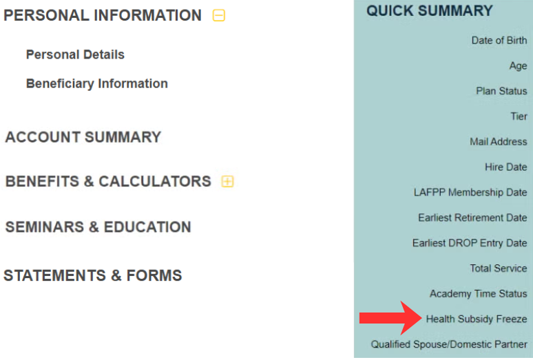 On the MyLAFPP homepage, you will see a Quick Summary (green box) of your information. To view if you are frozen or non-frozen, go to the ”Health Subsidy Freeze” line.