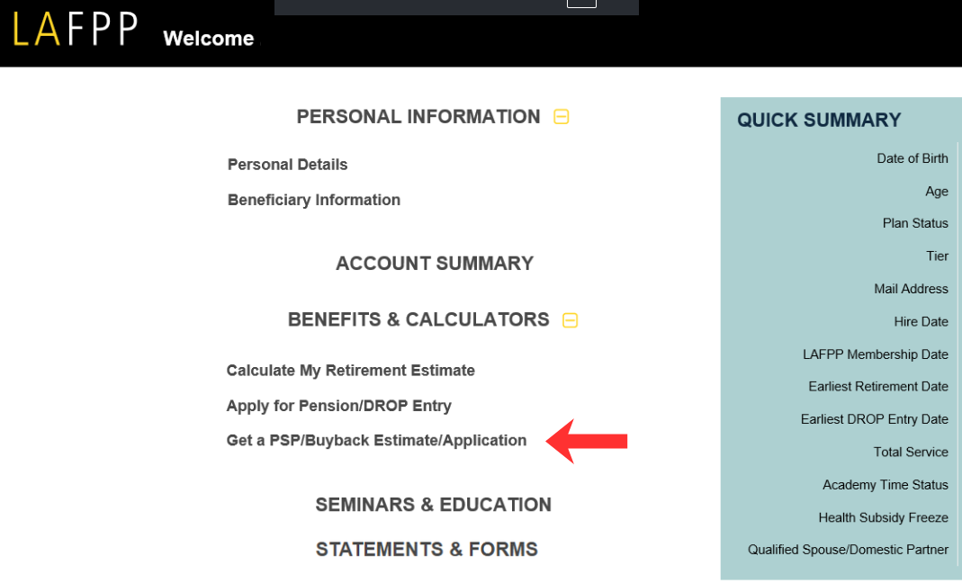 Click on the ”+” symbol next to Benefits & Calculators, then Click on Get a PSP/Buyback Estimate/Application